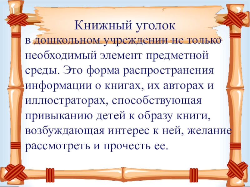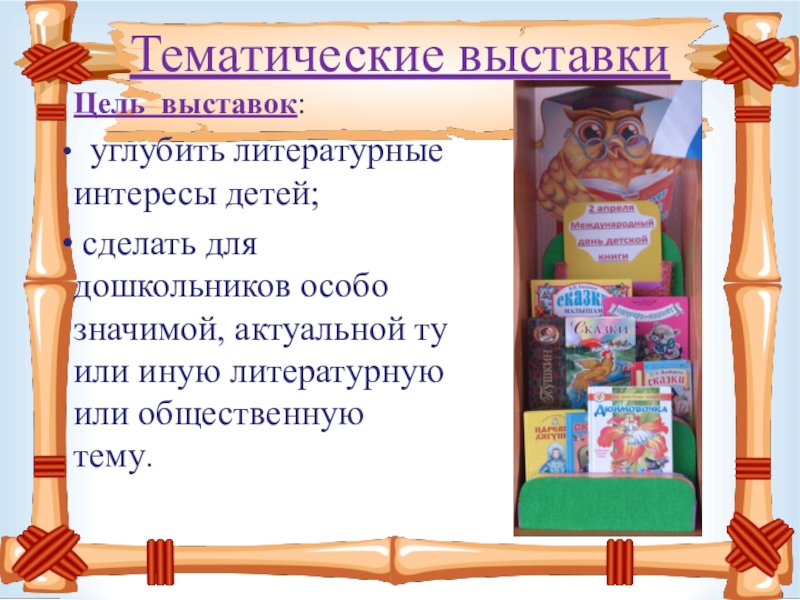 форма распространения информации о книгах, их авторах и иллюстраторах, способствующая привыканию детей к образу книги, возбуждающая интерес к ней, желание рассмотреть и прочесть ее.