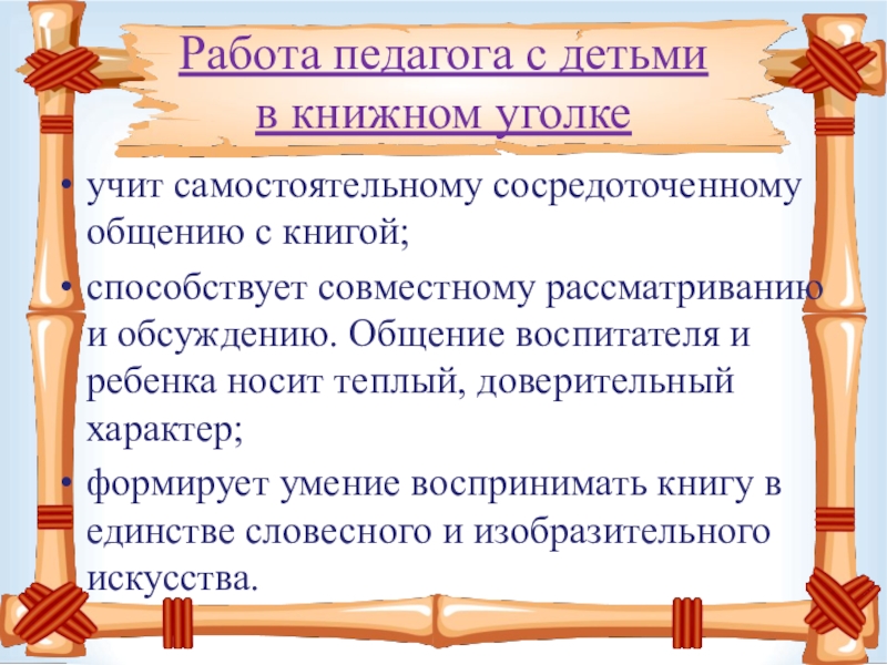 способствует совместному рассматриванию и обсуждению. Общение воспитателя и ребенка носит теплый, доверительный характер;