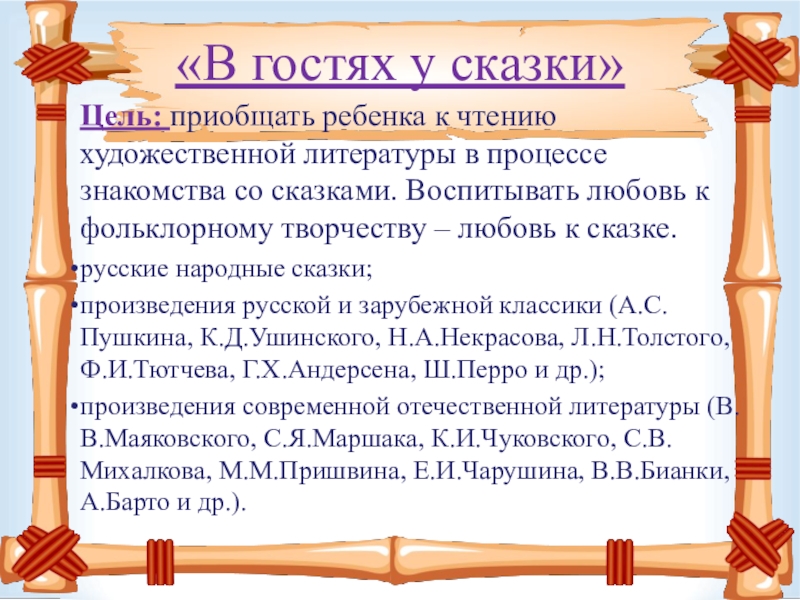 произведения русской и зарубежной классики (А.С.Пушкина, К.Д.Ушинского, Н.А.Некрасова, Л.Н.Толстого, Ф.И.Тютчева, Г.Х.Андерсена, Ш.Перро и др.);