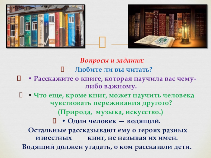 Вопросы и задания:  Любите ли вы читать? • Расскажите о книге, которая научила