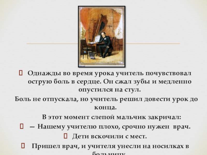 Однажды во время урока учитель почувствовал острую боль в сердце. Он сжал зубы и медленно опустился на