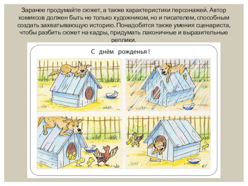 Слайд 20Заранее продумайте сюжет, а также характеристики персонажей. Автор комиксов должен быть