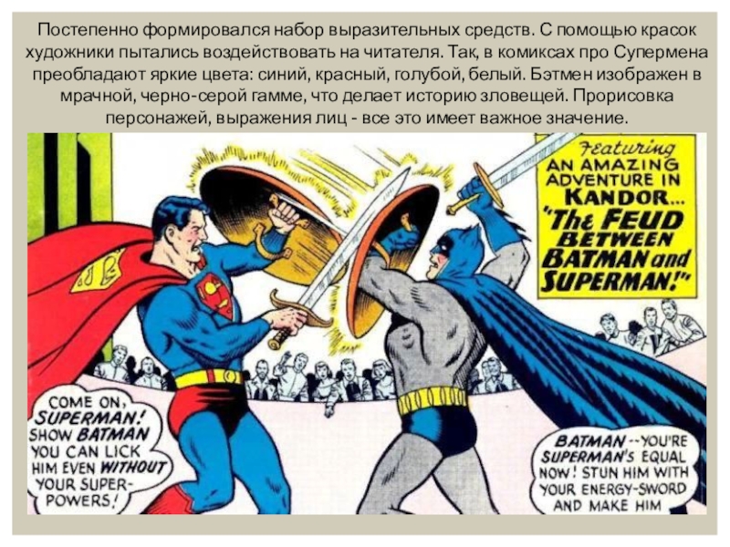 на читателя. Так, в комиксах про Супермена преобладают яркие цвета: синий, красный, голубой, белый. Бэтмен изображен в мрачной, черно-серой гамме, что делает историю зловещей. Прорисовка персонажей, выражения лиц - все это имеет важное значение.