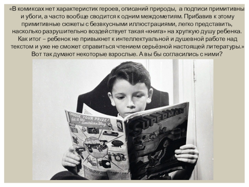 даже вредны для детей. Они считают, что дети, увлекающиеся комиксами, имеют нарушение функции восприятия и анализа текста.