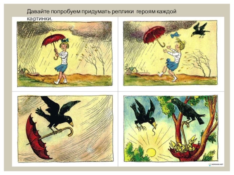 Слайд 21Давайте попробуем придумать реплики героям каждой картинки.