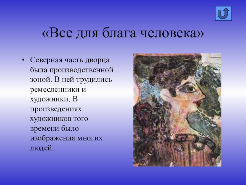 «Все для блага человека»Северная часть дворца была производственной зоной. В ней трудились ремесленники и художники. В произведениях