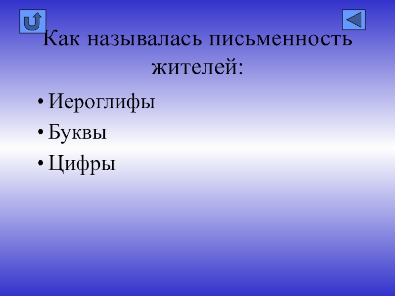 Как называлась письменность жителей:ИероглифыБуквыЦифры