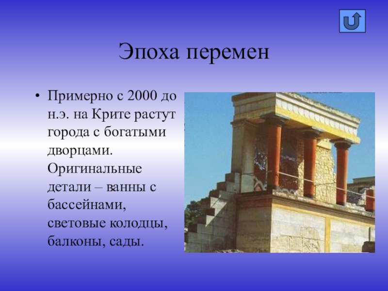 Эпоха переменПримерно с 2000 до н.э. на Крите растут города с богатыми дворцами. Оригинальные детали – ванны