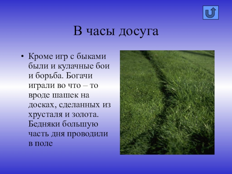 борьба. Богачи играли во что – то вроде шашек на досках, сделанных из хрусталя и золота. Бедняки большую часть дня проводили в поле