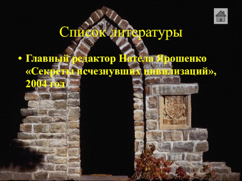 Список литературыГлавный редактор Натела Ярошенко «Секреты исчезнувших цивилизаций», 2004 год