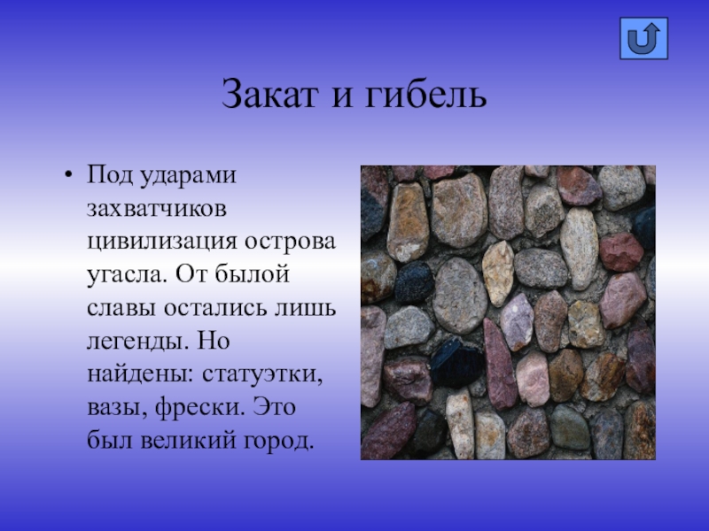Закат и гибельПод ударами захватчиков цивилизация острова угасла. От былой славы остались лишь легенды. Но найдены: статуэтки,