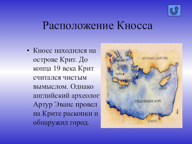 Расположение КноссаКносс находился на острове Крит. До конца 19 века Крит считался чистым вымыслом. Однако английский археолог