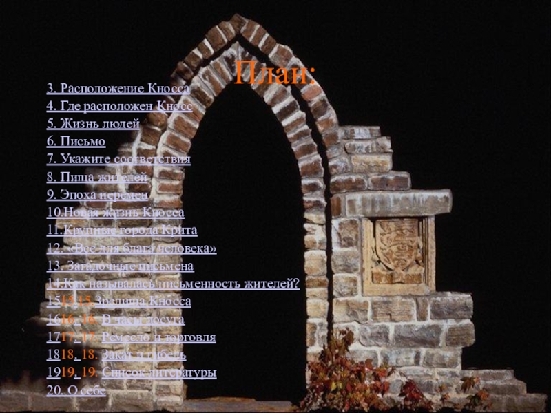 План:3. Расположение Кносса4. Где расположен Кносс5. Жизнь людей6. Письмо7. Укажите соответствия8. Пища жителей9. Эпоха перемен10.Новая жизнь Кносса