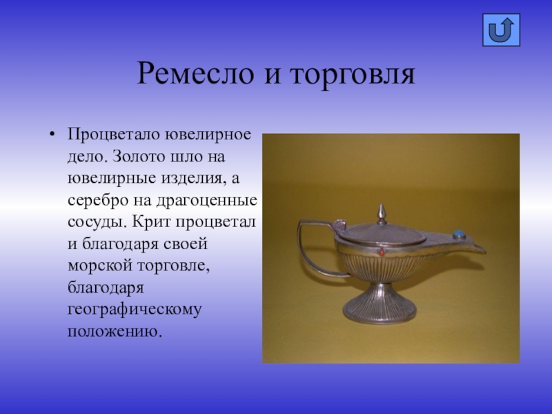 Ремесло и торговляПроцветало ювелирное дело. Золото шло на ювелирные изделия, а серебро на драгоценные сосуды. Крит процветал