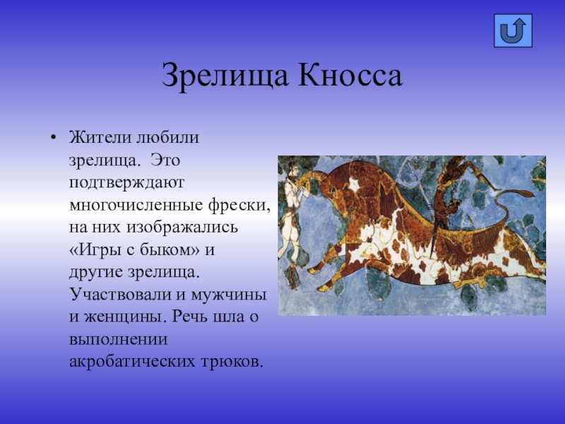 Зрелища КноссаЖители любили зрелища. Это подтверждают многочисленные фрески, на них изображались «Игры с быком» и другие зрелища.