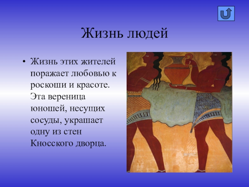 Жизнь людейЖизнь этих жителей поражает любовью к роскоши и красоте. Эта вереница юношей, несущих сосуды, украшает одну