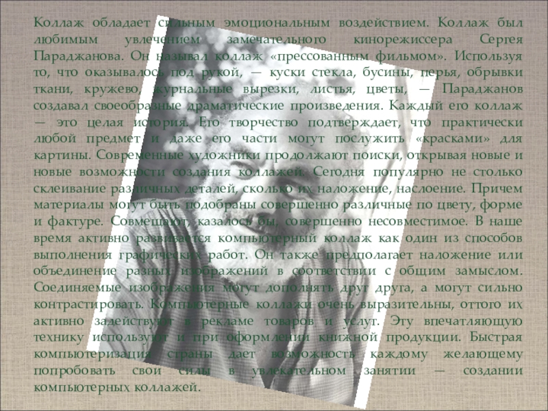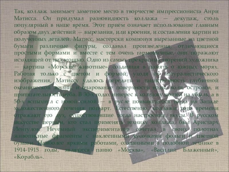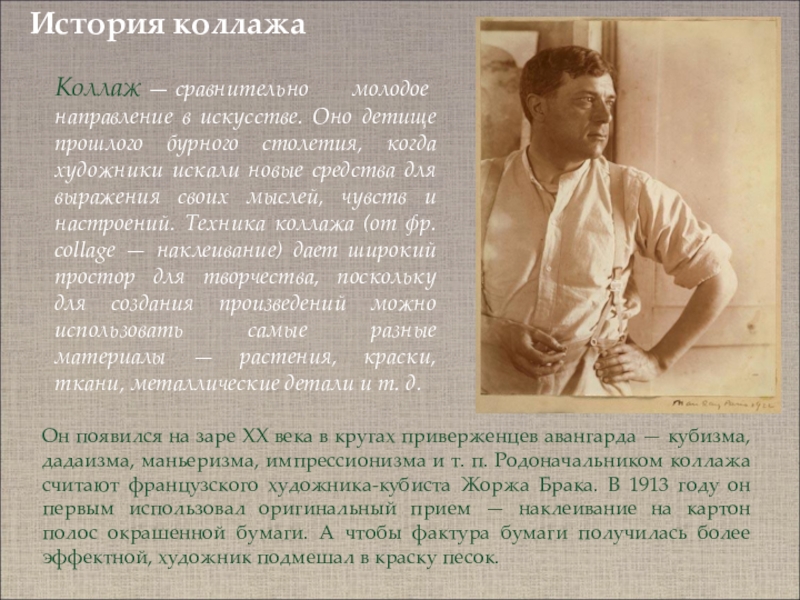 Он появился на заре XX века в кругах приверженцев авангарда — кубизма, дадаизма, маньеризма, импрессионизма и т. п. Родоначальником коллажа считают французского художника-кубиста Жоржа Брака. В 1913 году он первым использовал оригинальный прием — наклеивание на картон полос окрашенной бумаги. А чтобы фактура бумаги получилась более эффектной, художник подмешал в краску песок.