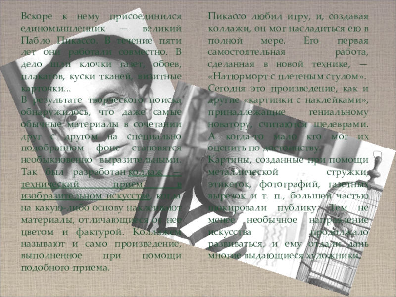 Пикассо любил игру, и, создавая коллажи, он мог насладиться ею в полной мере. Его первая самостоятельная работа, сделанная в новой технике, — «Натюрморт с плетеным стулом».
