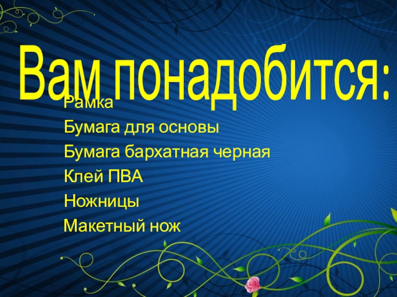 Вам понадобится:РамкаБумага для основыБумага бархатная чернаяКлей ПВАНожницыМакетный нож