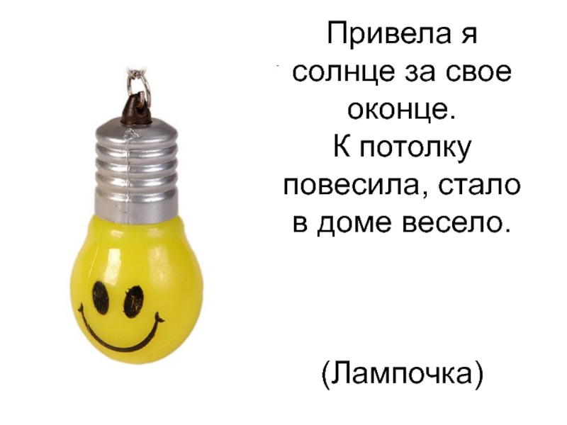 Привела я солнце за свое оконце. К потолку повесила, стало в доме весело.    (Лампочка)