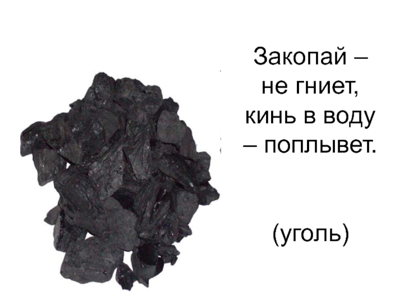 Слайд 14Закопай – не гниет, кинь в воду – поплывет. (уголь)