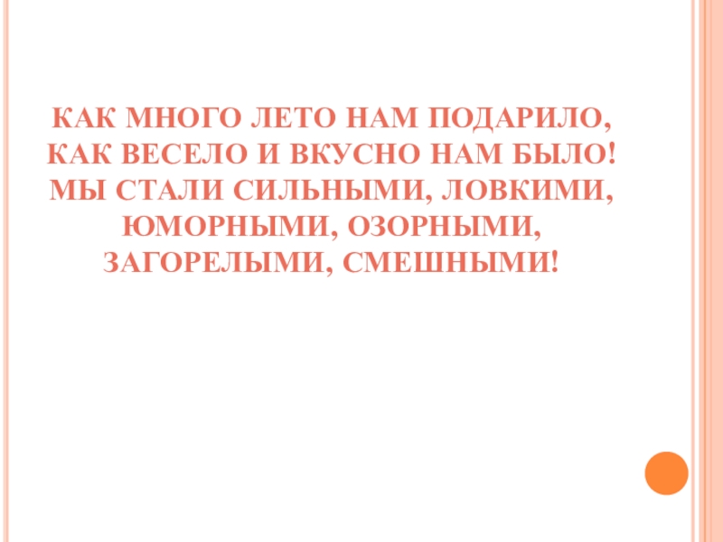 КАК МНОГО ЛЕТО НАМ ПОДАРИЛО, КАК ВЕСЕЛО И ВКУСНО НАМ БЫЛО! МЫ СТАЛИ СИЛЬНЫМИ, ЛОВКИМИ, ЮМОРНЫМИ, ОЗОРНЫМИ,