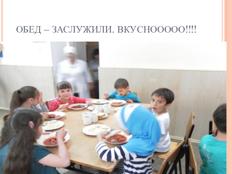 Слайд 7ОБЕД – ЗАСЛУЖИЛИ. ВКУСНООООО!!!!