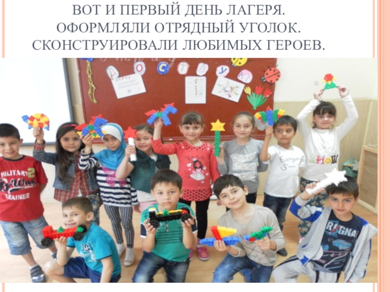 Слайд 2ВОТ И ПЕРВЫЙ ДЕНЬ ЛАГЕРЯ. ОФОРМЛЯЛИ ОТРЯДНЫЙ УГОЛОК. СКОНСТРУИРОВАЛИ ЛЮБИМЫХ ГЕРОЕВ.