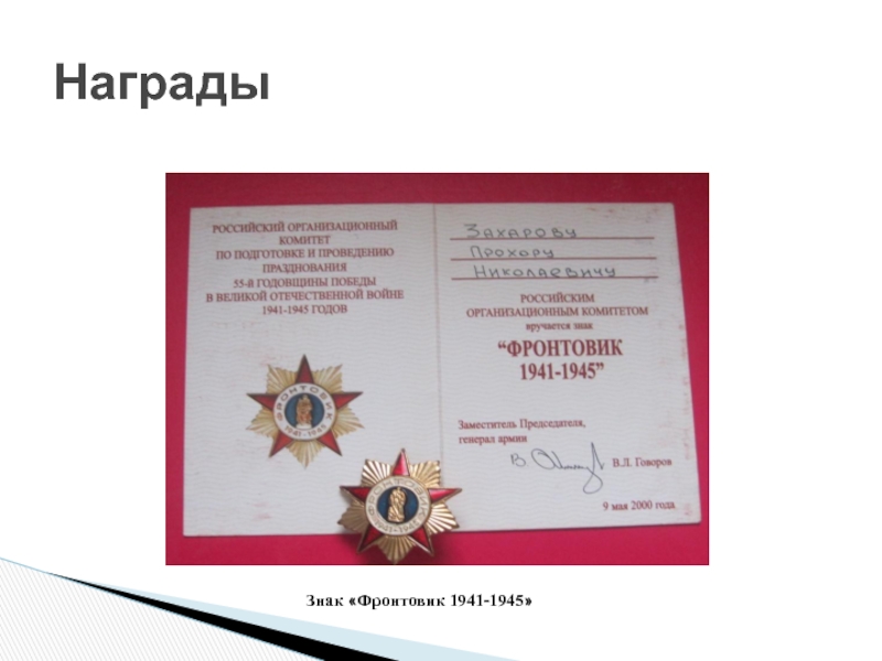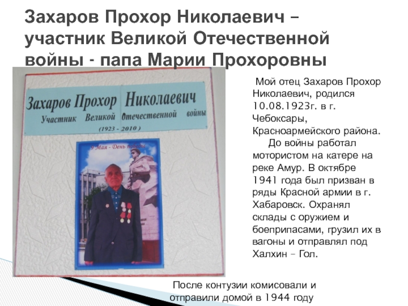 Мой отец Захаров Прохор Николаевич, родился 10.08.1923г. в г. Чебоксары, Красноармейского района.