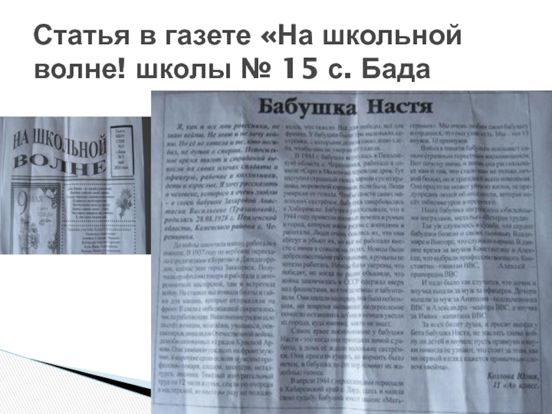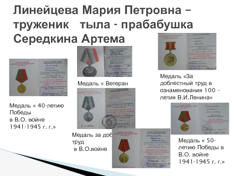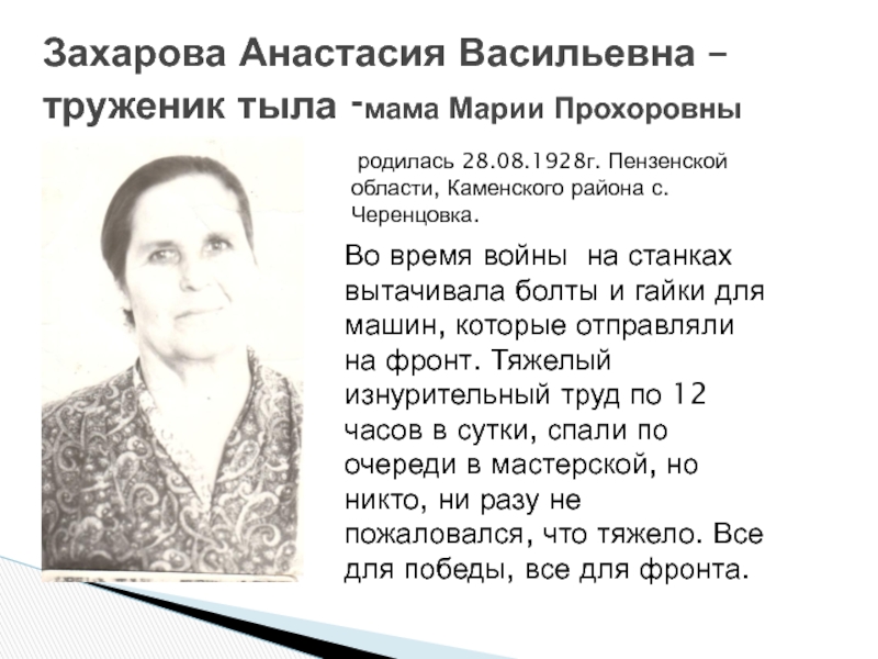 Во время войны на станках вытачивала болты и гайки для машин, которые отправляли на фронт. Тяжелый изнурительный труд по 12 часов в сутки, спали по очереди в мастерской, но никто, ни разу не пожаловался, что тяжело. Все для победы, все для фронта.