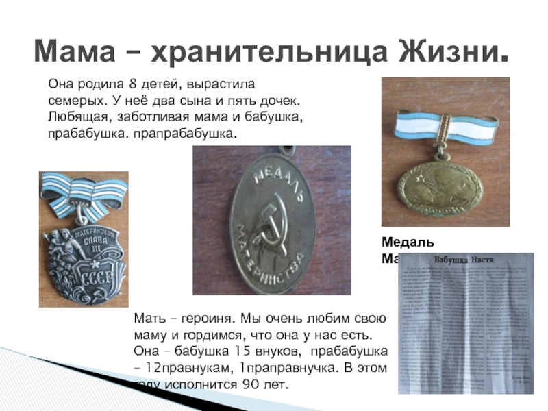 Она родила 8 детей, вырастила семерых. У неё два сына и пять дочек. Любящая, заботливая мама и бабушка, прабабушка. прапрабабушка.