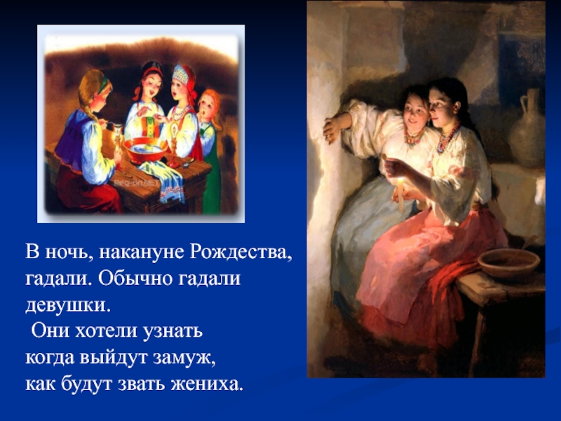 января время Святок, то есть Святых вечеров. Во время Святок молодёжь веселилась, каталась с гор, ходили в гости и обязательно колядовали: пели поздравительные песни-колядки. Ребята, девчата и взрослые наряжались так, чтобы их не узнали: лица мазали сажей, закрывали масками.