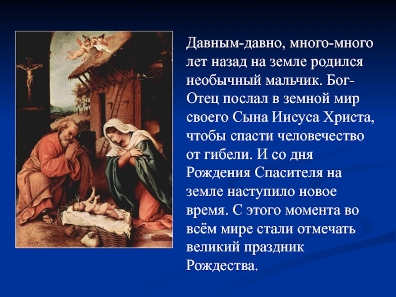 Слайд 4Давным-давно, много-много лет назад на земле родился необычный мальчик. Бог-Отец послал
