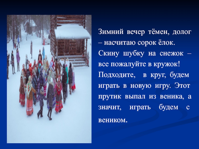 Подходите, в круг, будем играть в новую игру. Этот прутик выпал из веника, а значит, играть будем с веником.