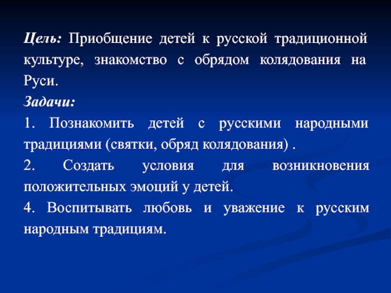 1. Познакомить детей с русскими народными традициями (святки, обряд колядования) .