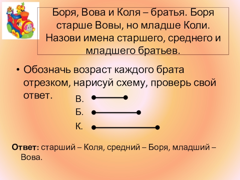 Ответ: старший – Коля, средний – Боря, младший – Вова.