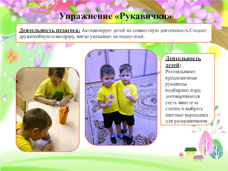 Деятельность детей: Разглядывают предложенные рукавицы, подбирают пару, договариваются сесть вместе за столик и выбрать цветные карандаши для раскрашивания.