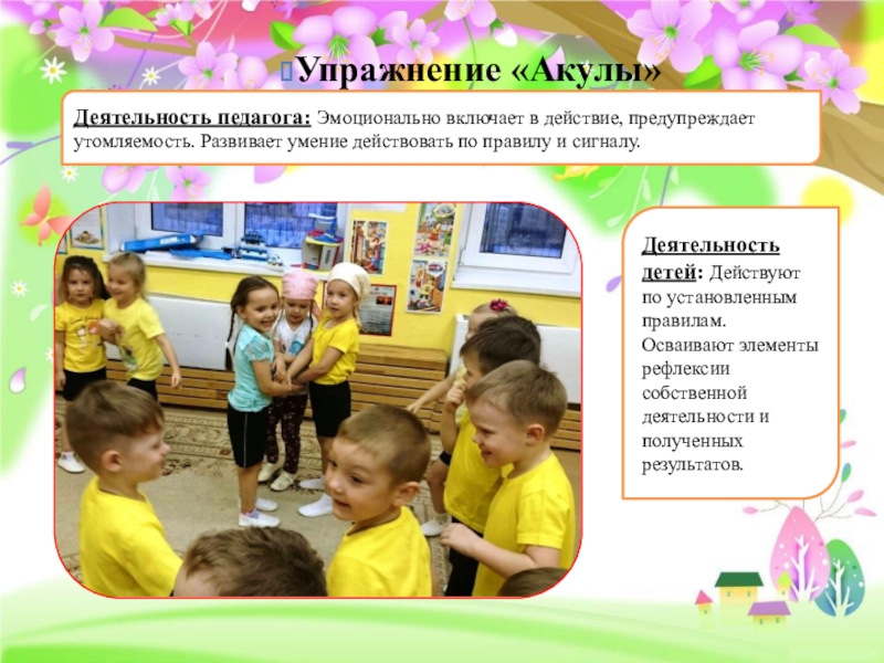 Деятельность педагога: Помогает соблюдать озвученные правила. Эмоционально поддерживает детей. Активизирует речевую активность детей.