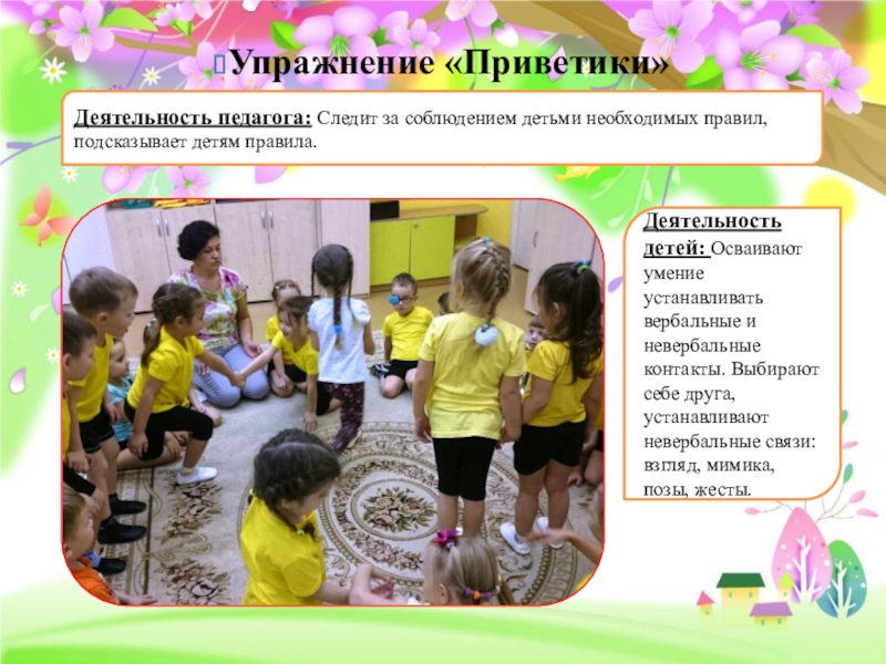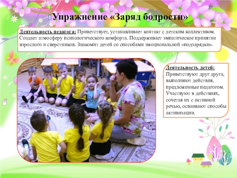 Деятельность детей: Приветствуют друг друга, выполняют действия, предложенные педагогом. Участвуют в действиях, сочетая их с активной речью, осваивают способы активизации.