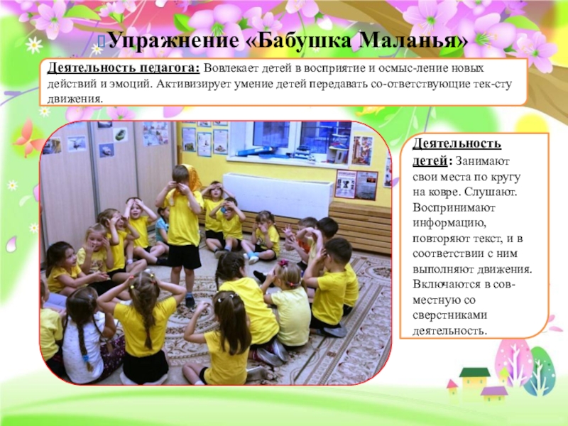 Деятельность детей: Занимают свои места по кругу на ковре. Слушают. Воспринимают информацию, повторяют текст, и в соответствии с ним выполняют движения. Включаются в сов-местную со сверстниками деятельность.