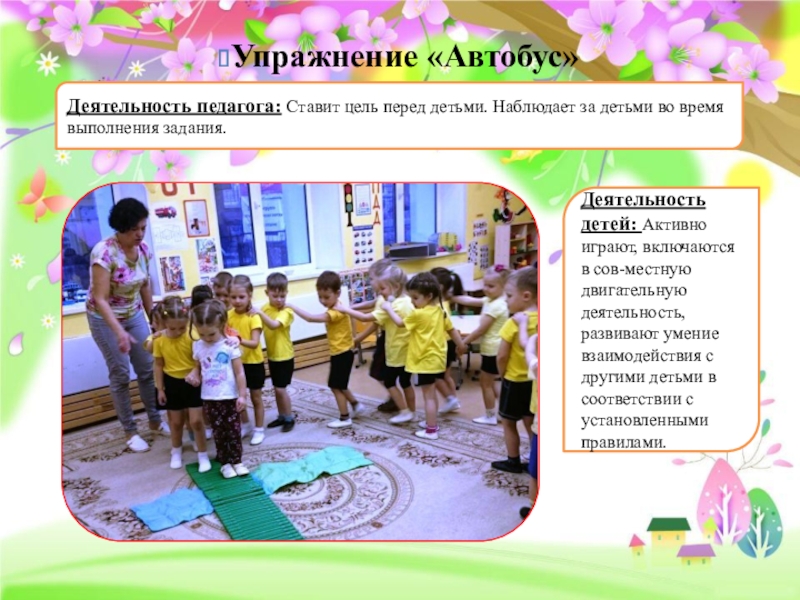 Деятельность детей: Активно играют, включаются в сов-местную двигательную деятельность, развивают умение взаимодействия с другими детьми в соответствии с установленными правилами.