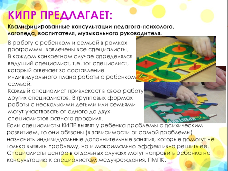 Каждый специалист привлекает в свою работу других специалистов. В групповых формах работы с несколькими детьми или семьями могут участвовать от одного до двух специалистов разного профиля.