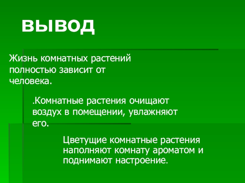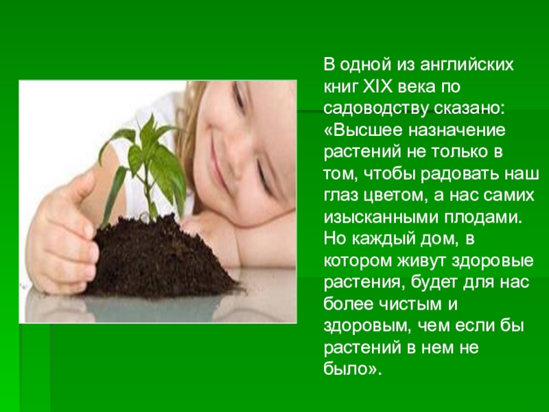 назначение растений не только в том, чтобы радовать наш глаз цветом, а нас самих изысканными плодами. Но каждый дом, в котором живут здоровые растения, будет для нас более чистым и здоровым, чем если бы растений в нем не было».
