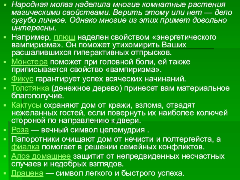 Слайд 29Народная молва наделила многие комнатные растения магическими свойствами. Верить этому или