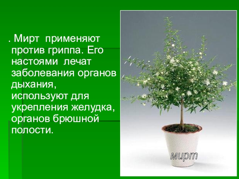 Слайд 34 . Мирт применяют против гриппа. Его настоями лечат заболевания органов