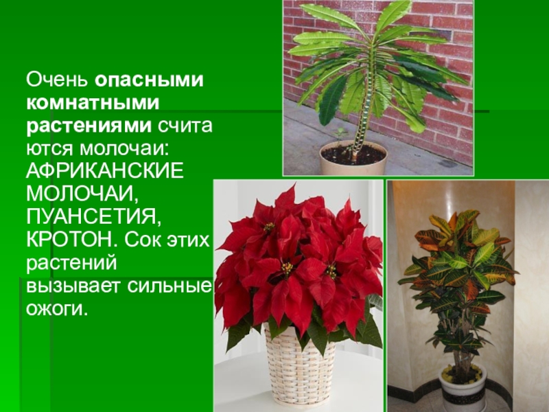 Слайд 39 Очень опасными комнатными растениями считаются молочаи: АФРИКАНСКИЕ МОЛОЧАИ, ПУАНСЕТИЯ, КРОТОН. Сок этих растений