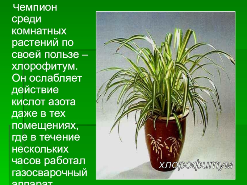 Слайд 33 Чемпион среди комнатных растений по своей пользе – хлорофитум.