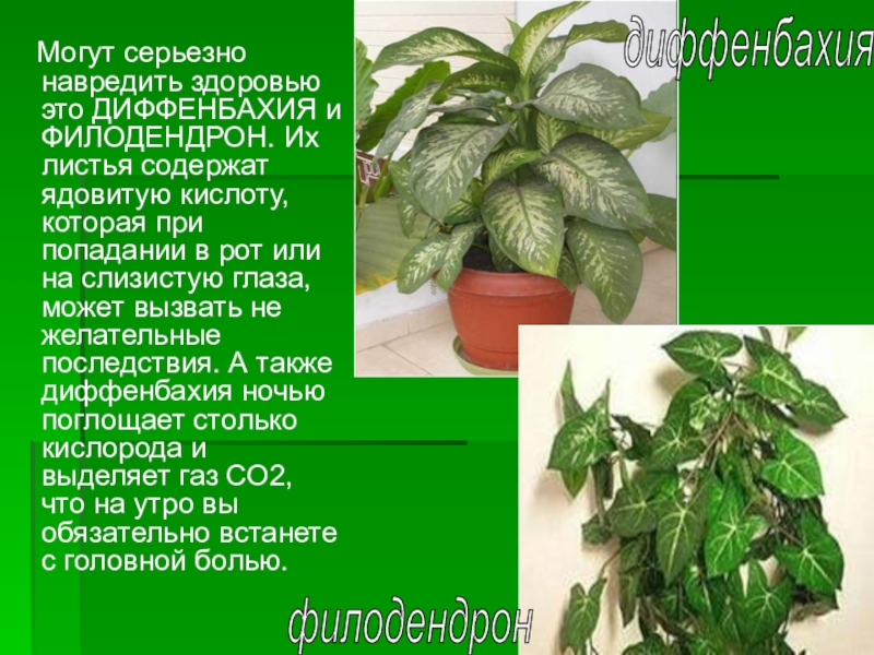 Слайд 38 Могут серьезно навредить здоровью это ДИФФЕНБАХИЯ и ФИЛОДЕНДРОН. Их