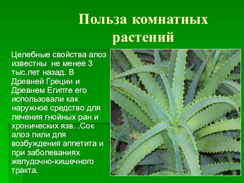 тыс.лет назад. В Древней Греции и Древнем Египте его использовали как наружное средство для лечения гнойных ран и хронических язв. .Сок алоэ пили для возбуждения аппетита и при заболеваниях желудочно-кишечного тракта.