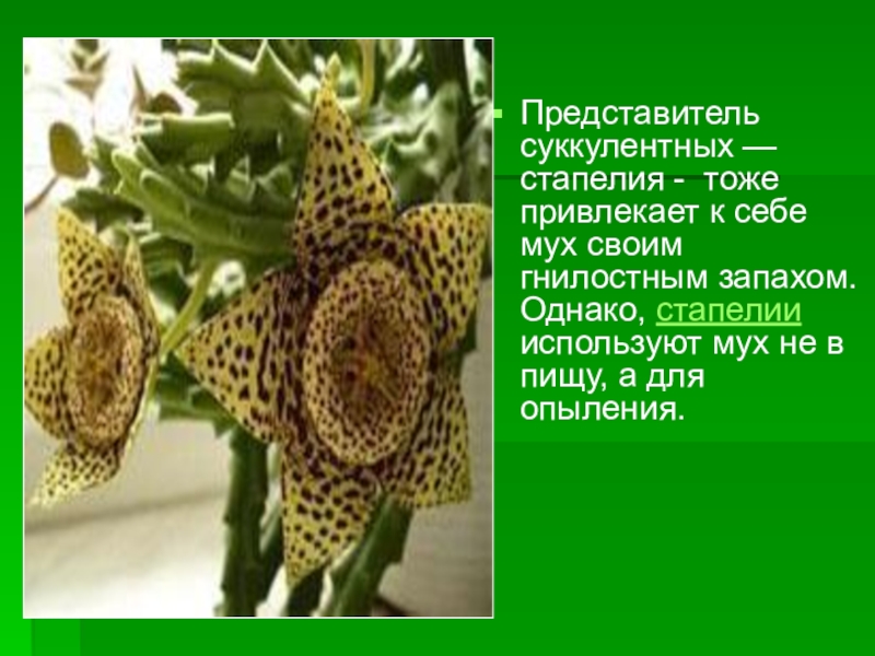 Слайд 24Представитель суккулентных — стапелия - тоже привлекает к себе мух своим